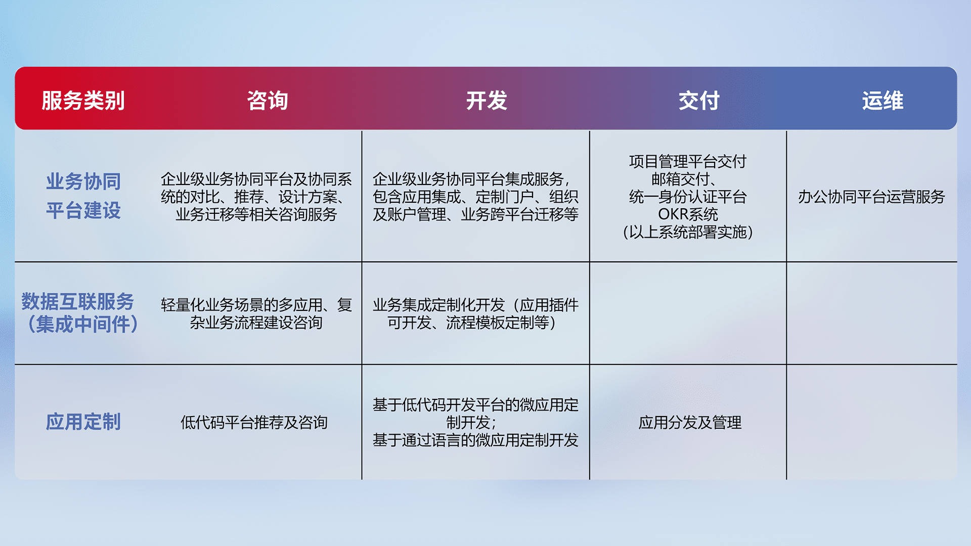 针对钉钉、、、企微、、IDaas等平台级产品提供产品的规划、、、方案、、交付、、、定制化开发等服务,,实现如统一协同办公、、智能客户服务、、混合会议管理、、、智能数据查询、、等业务场景,,,,实现数字化转型。。