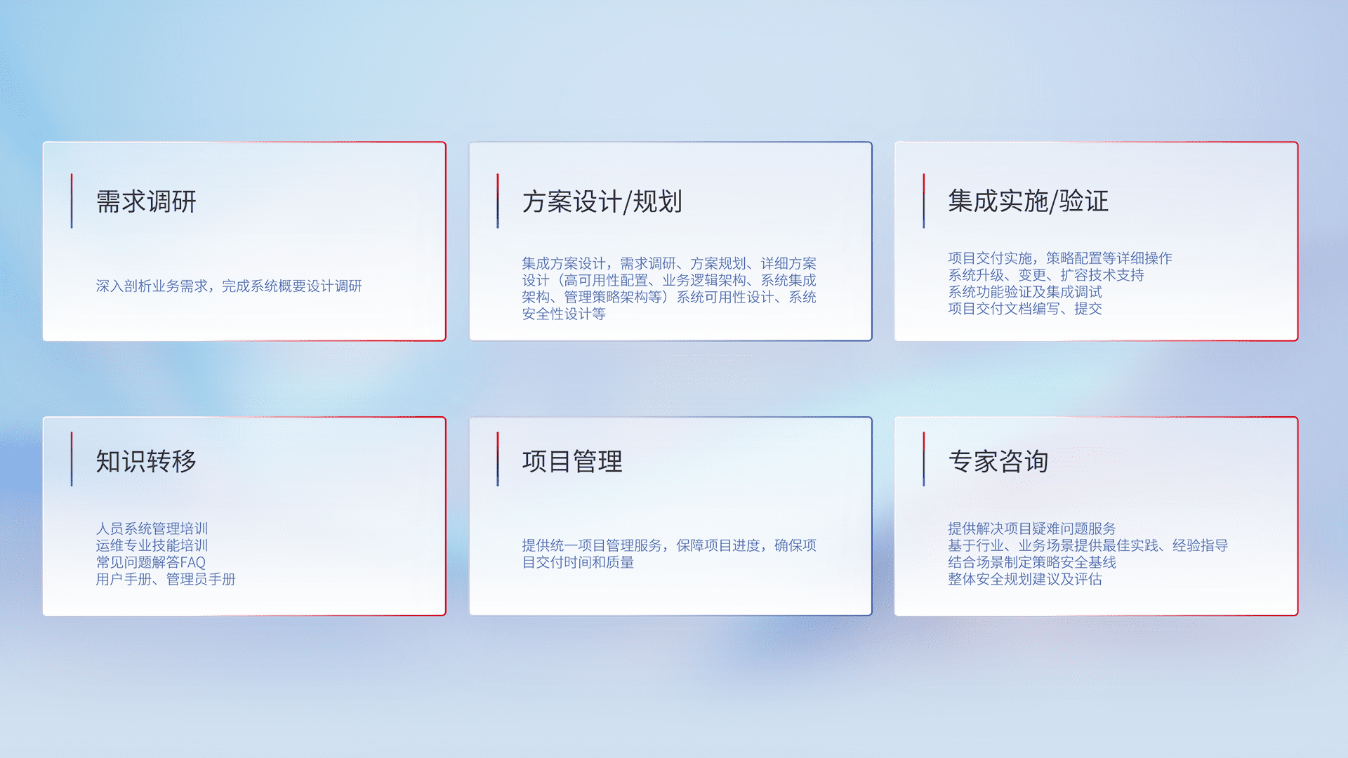 针对客户行业特性,,将宏观的安全战略和需求,,通过专业的交付服务,,,,实现项目落地,,为客户提供标准规范的集成交付服务。。